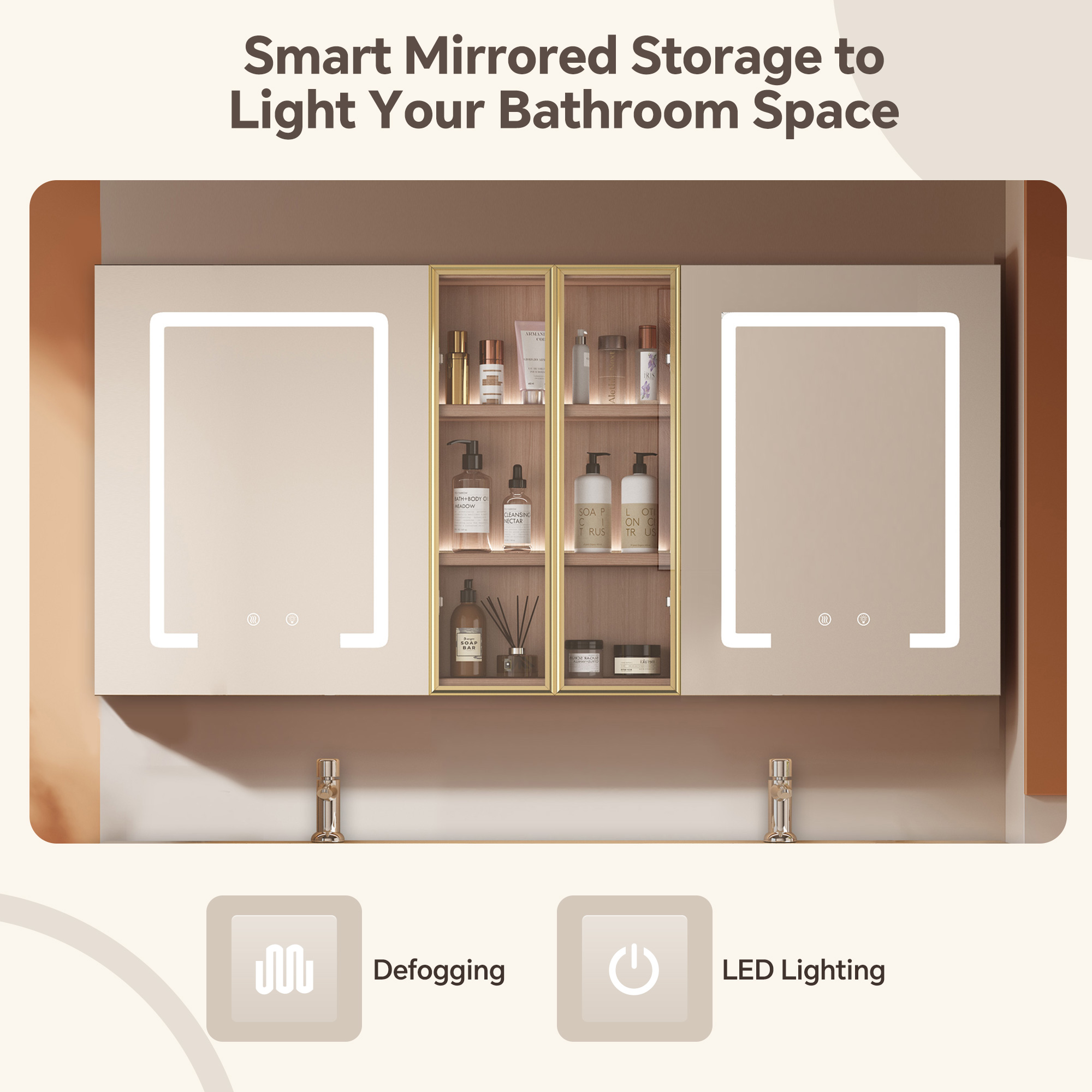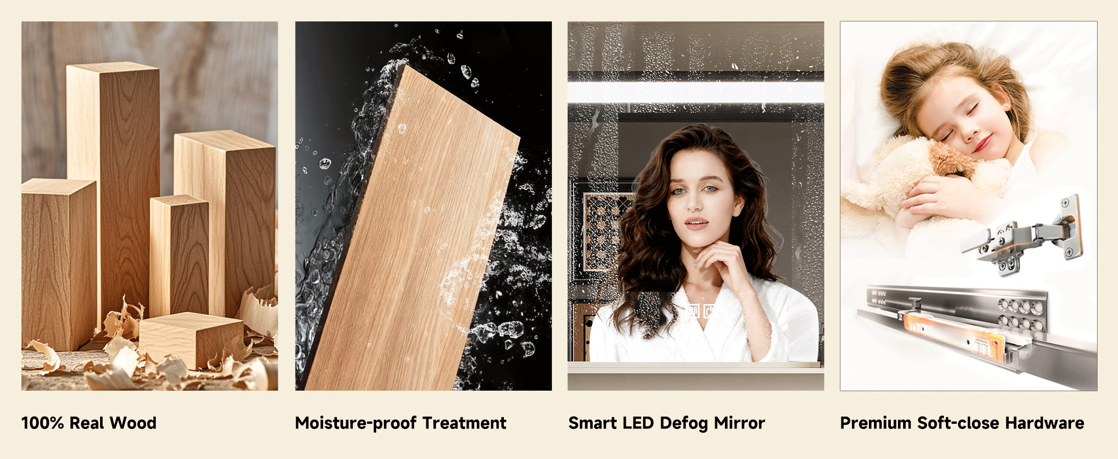 3.Smart Mirrored Cabinet:The smart storage mirrored cabinet of this solid wood bathroom vanity with sink is equipped with a one-touch fill light function; the soft light is ideal for daily dressing and makeup. Its interior can store bathroom essentials, allowing easy access while keeping the countertop tidy – blending smart functionality with storage practicality.