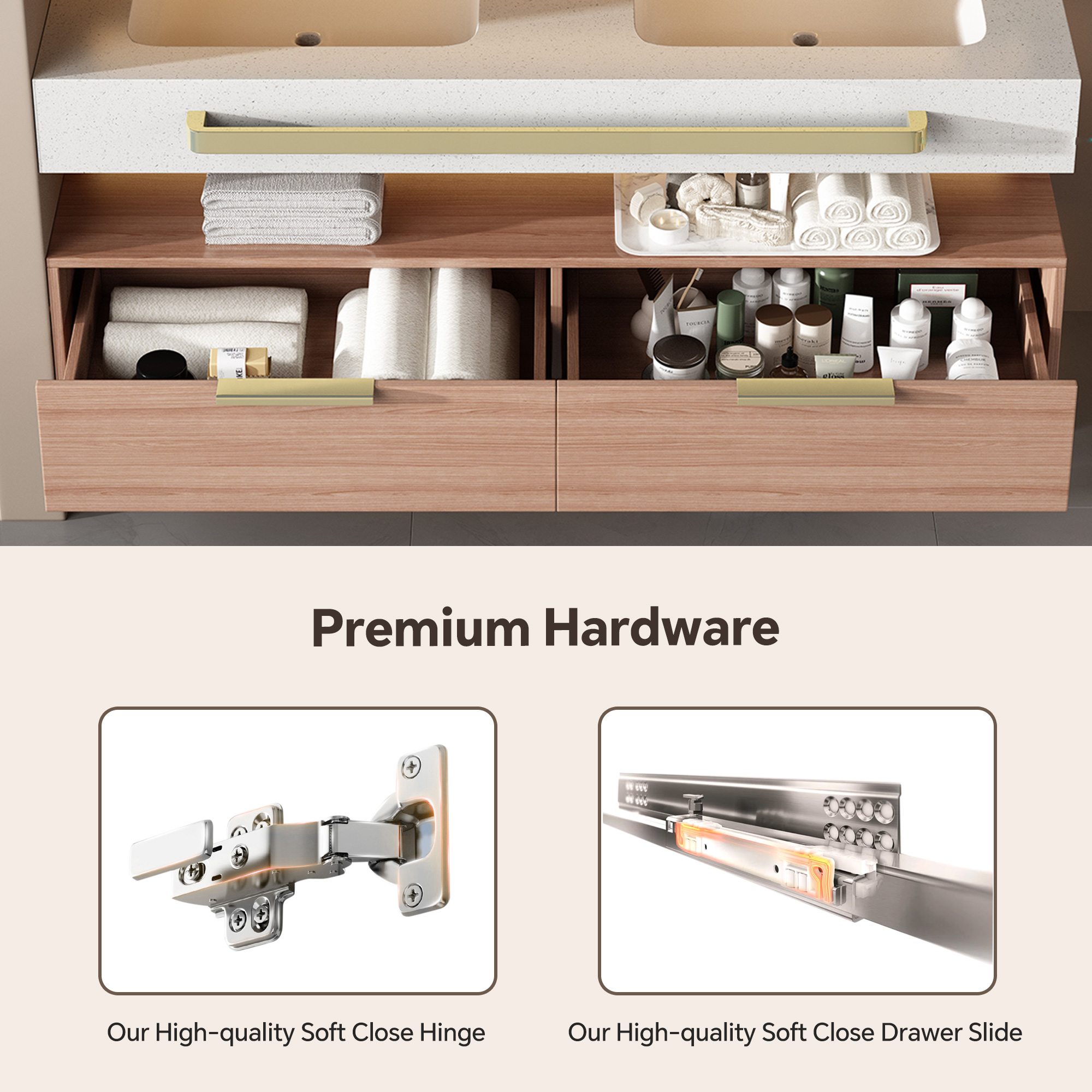 - Premium Soft-close Hardware:The cabinet is fitted with soft-close hinges and hydraulic soft-close slides: The hinges feature buffer functionality for smooth operation without harsh noise. The slides have passedcountlessopening-and-closing tests, ensuring sturdiness and durability. Opening and closing drawers or cabinet doors is easy and labor-saving, and the hardware remains stable through long-term use.