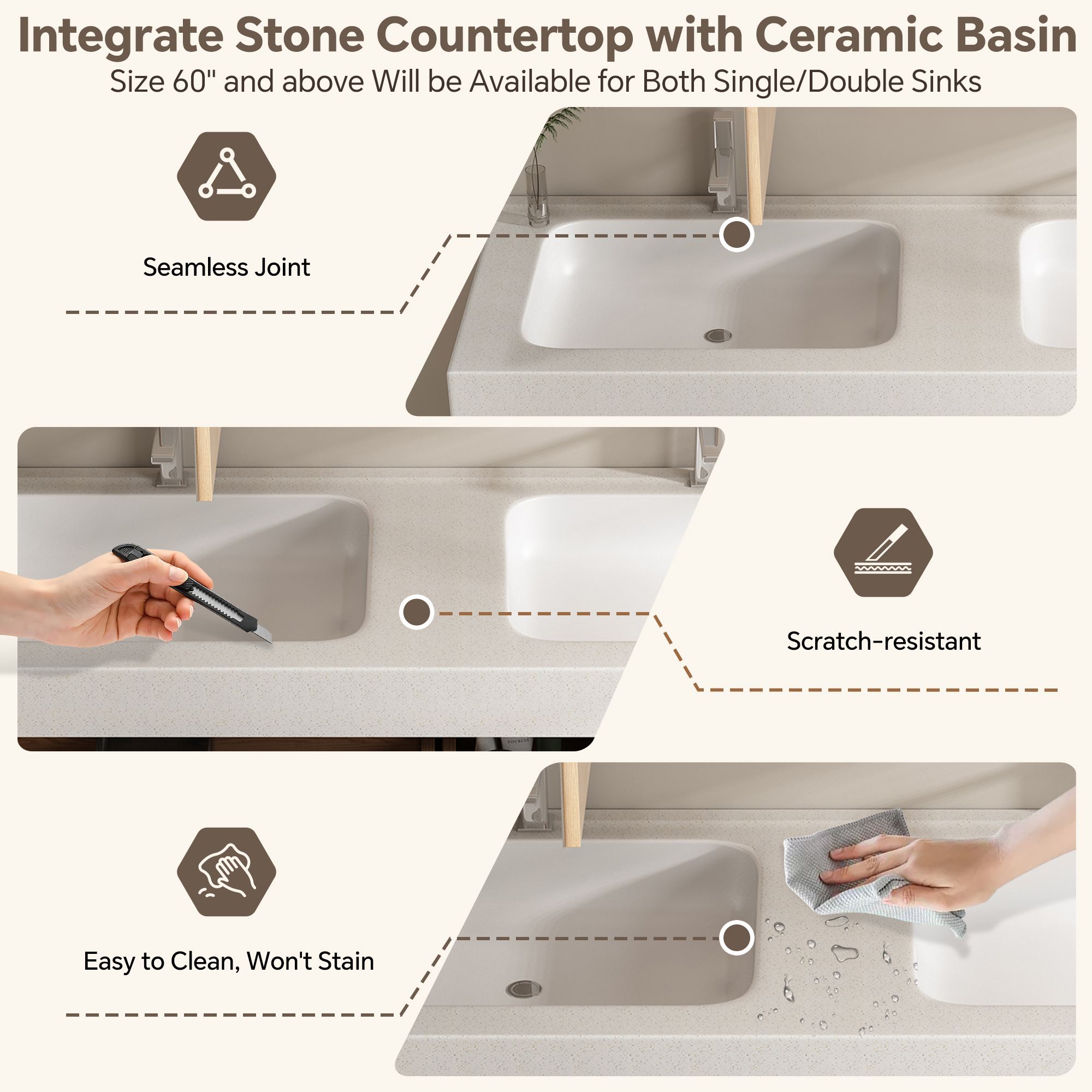 - Integrate Stone countertopCeramic Basin:The countertop of this bathroom sink cabinet adopts a integratedsintered stone seamless ceramic basin design: The sintered stone material has a smooth finish but high-hardness surface, which is scratch-resistant and durable. The one-piece countertop is smooth with low water absorption, resisting limescale and grime buildup for easy maintenance; it stays bright and new with long-term use, while the sturdy material resists cracking for a calm, sophisticated look.