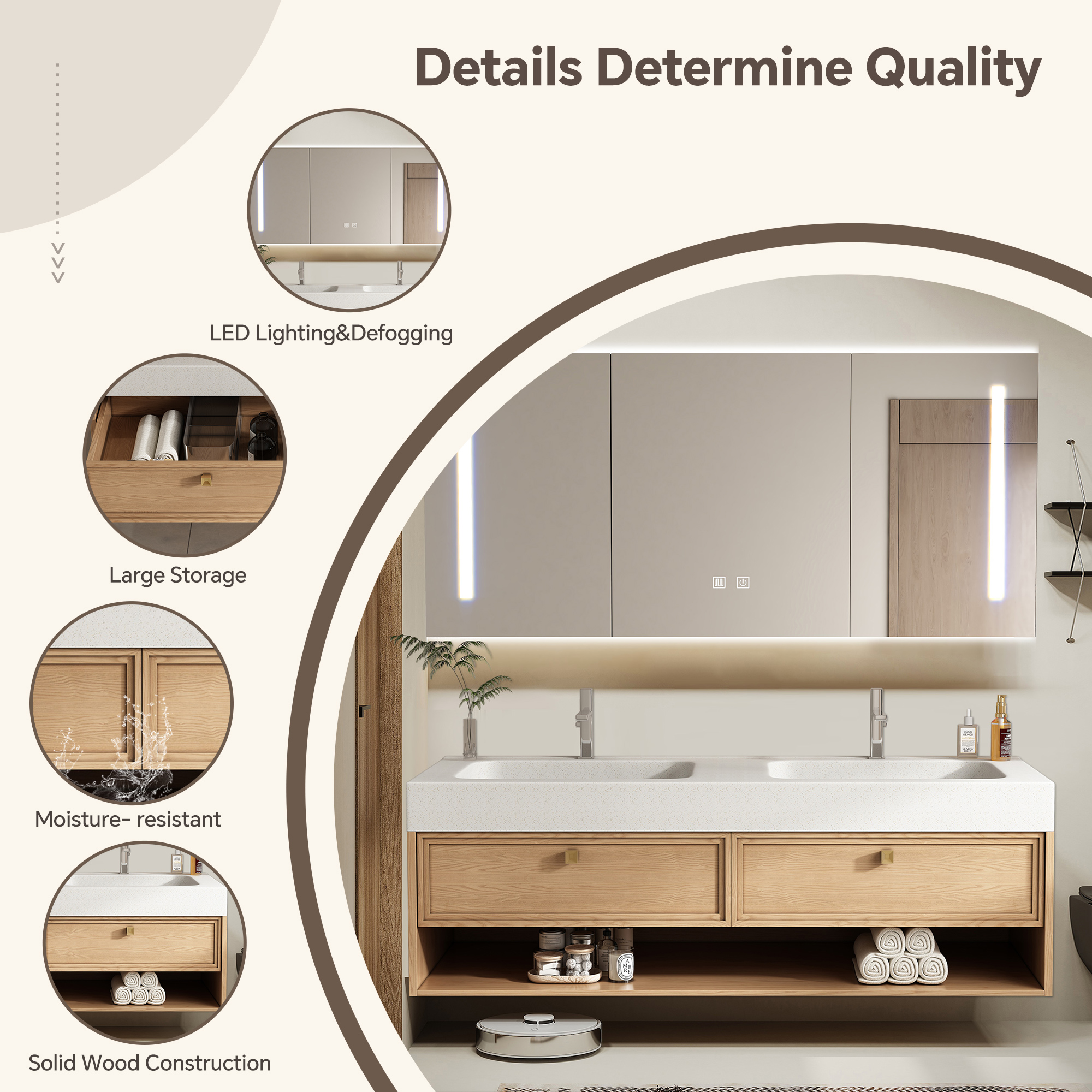 - Smart MirroredCabinet:Themirror is equiped with smart led lighting and one-touch defogging function, and the mirrored storage of this solid wood bathroom vanity with sink includes divided storage compartments, which neatly organize various bathroom essentials to meet daily storage needs. The tidy storage design keeps the space visually uncluttered, blending practicality and aesthetics to keep your bathroom neat and organized.